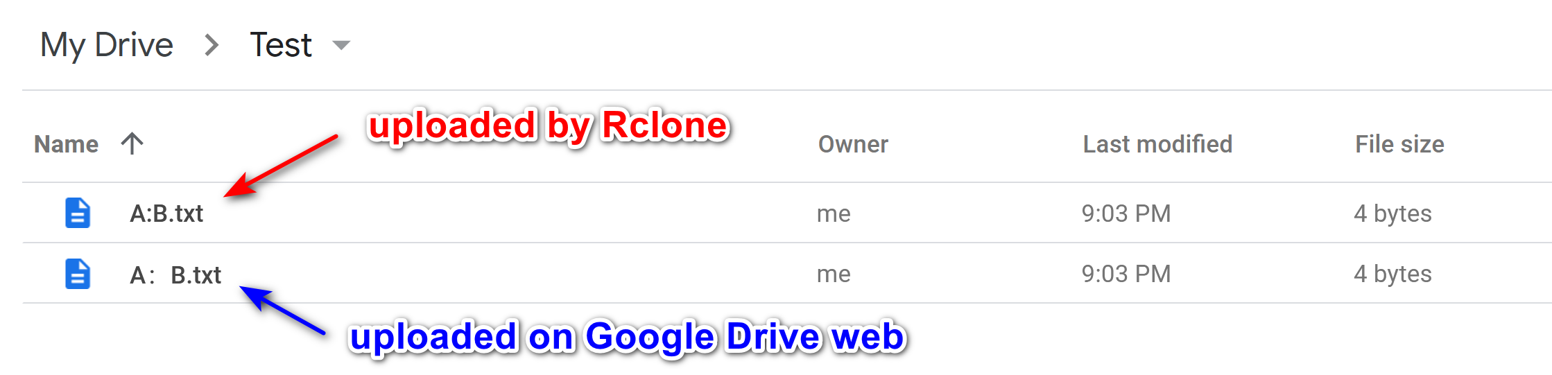 Actual result: Rclone mistakenly uploads a new file named A:B.txt, which becomes a duplicate of the original file. See screenshot below: