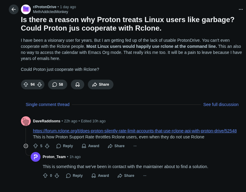 Also, proton drive official support claims they are working with the Rclone maintainer who handles proton drive support. I am really not sure if that is correct. The reddit comment was posted today from their account.