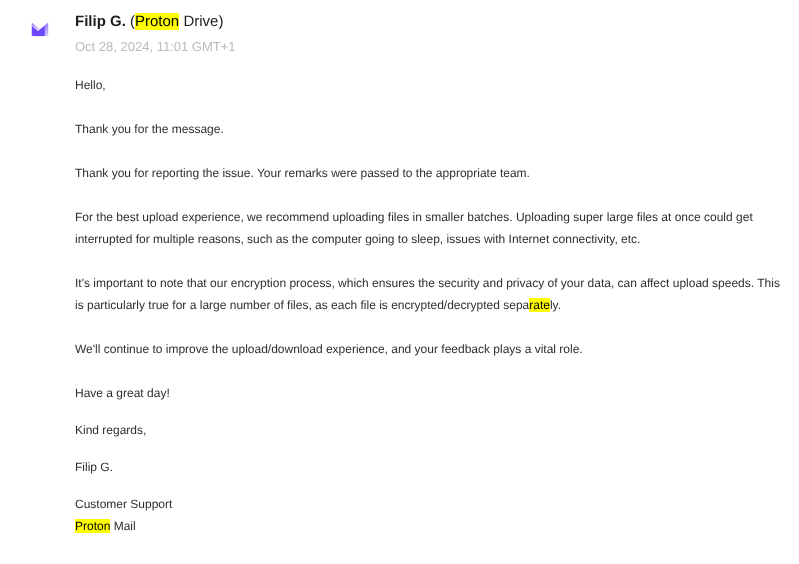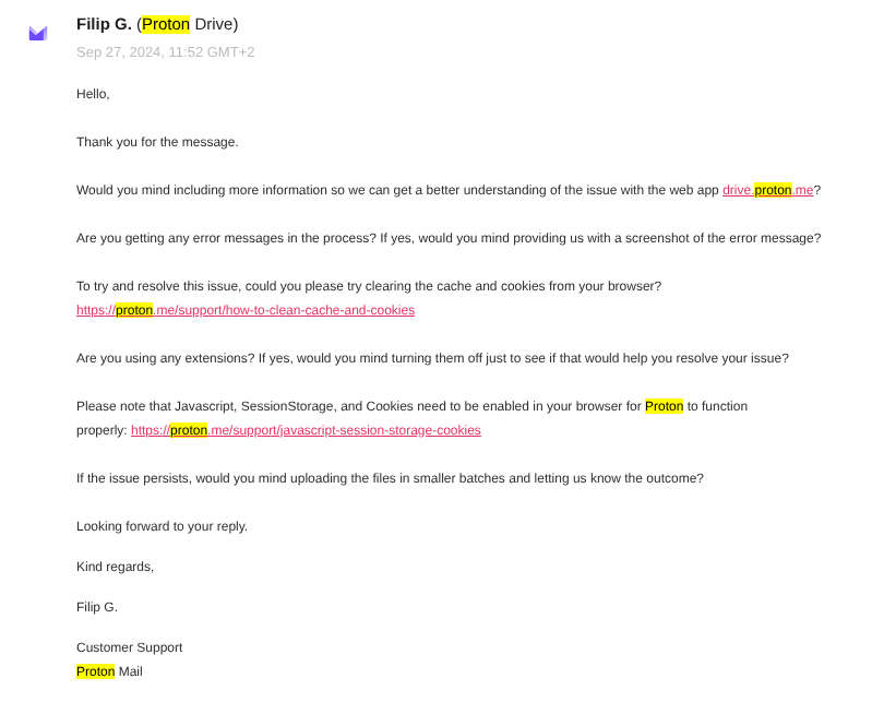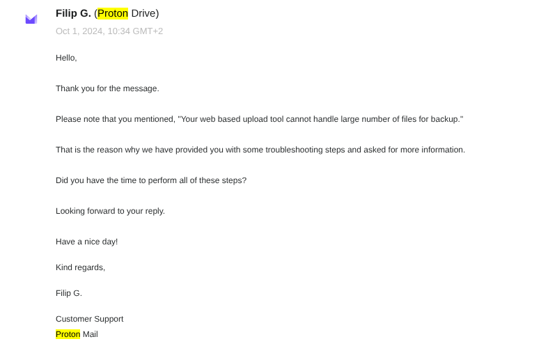 Oct 14 – Oct 22, 2024 – Continued pressing them, Proton still avoided saying rclone was blocked.