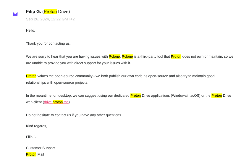 Back in September 2024, rclone suddenly stopped working with Proton Drive. I raised a support ticket with Proton (support AT protondrive.zendesk DOT com) and what followed was a long back-and-forth that never gave me a clear answer. Instead, the replies felt like Proton was dodging the issue.
