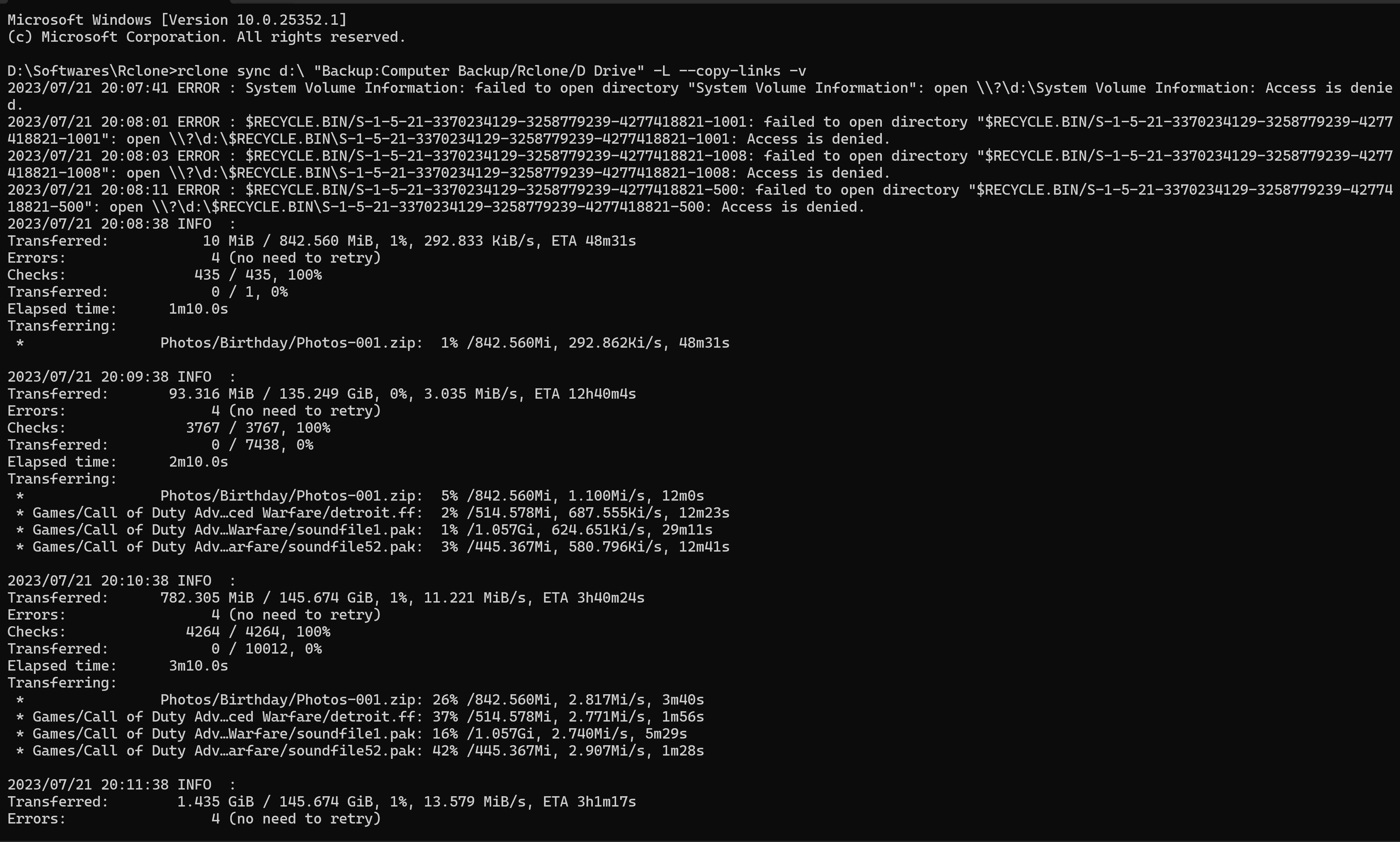 rclone sync d:\ "Backup:Computer Backup/Rclone/D Drive" -L --copy-links -v