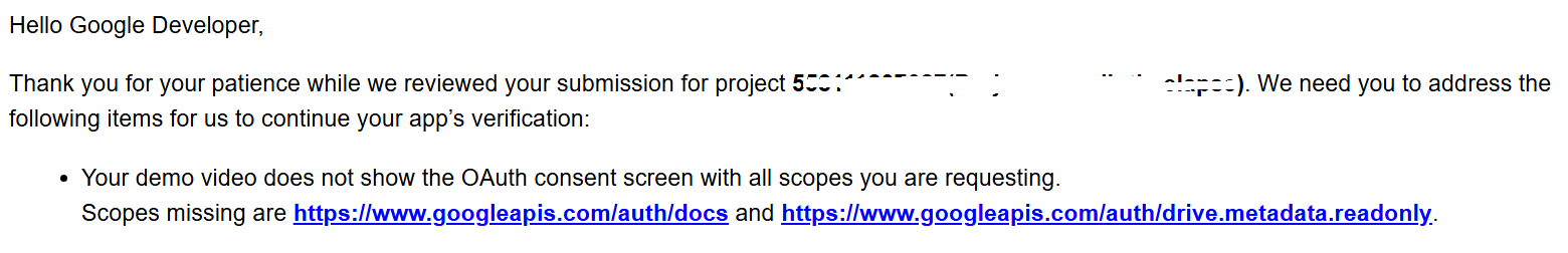 So, i’ve been making my own client ID for Google Drive. It’s a bit of a pain as i’m learning as I go, but i think i’m almost there, hopefully. The last response I’ve had from Google about my Oauth process video is below.
