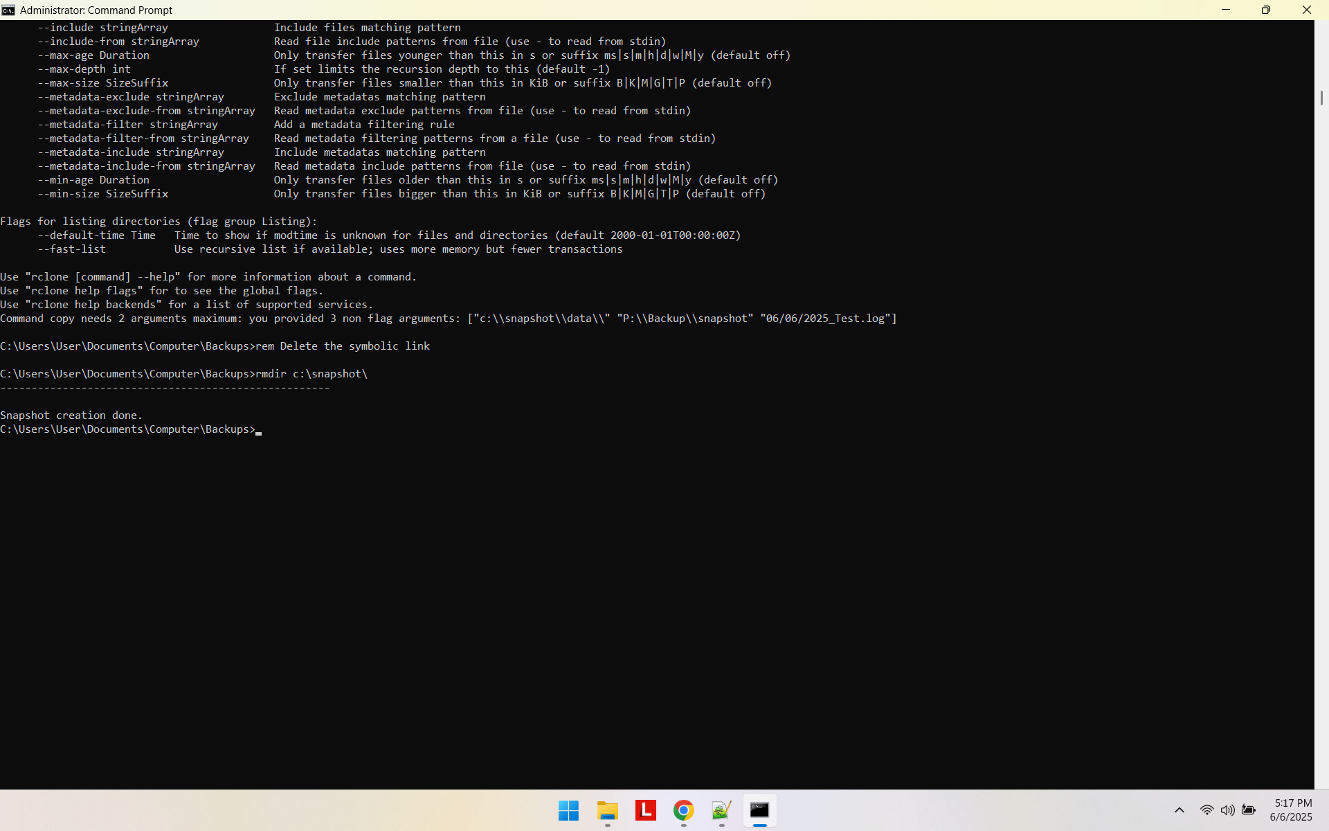 rem rclone copy c:\snapshot\data\ P:\Backup\snapshot --log-file=C:\data%date%_Test.log -P -vv