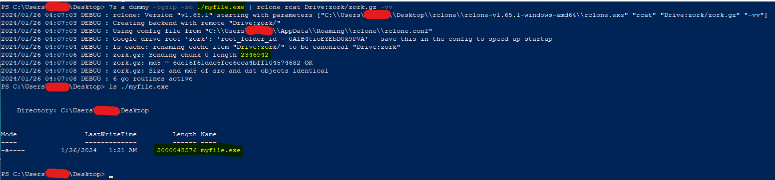 PS C:\Users\T\Desktop> 7z a dummy -tgzip -so ./myfile.exe | rclone rcat Drive:zork/zork.gz -vv