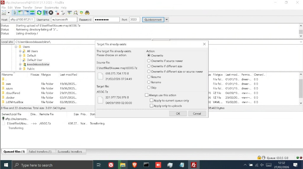 I am struggling to upload a 700GB .7z file to a Telegram-based backend (TGFS). The upload keeps failing because my local system disk hits 0% free space, causing the mount and the SFTP server to crash.